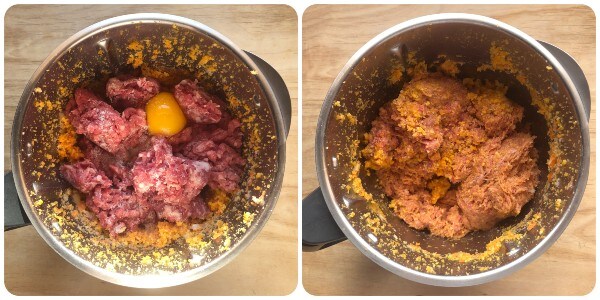 À ce stade, ajouter la viande hachée, la saucisse sans la peau et coupée en morceaux, l’œuf et une bonne pincée de sel. Bien mélanger tous les ingrédients (vel 5. sens inverse, 30 sec.).