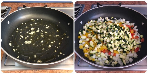 Peler les gousses d’ail, retirer le germe central et les hacher finement.Dans une grande casserole, chauffer quelques cuillères d’huile et y faire revenir la moitié de l’ail haché. Laisser grésiller un instant puis ajouter tous les légumes.