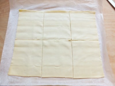 Dérouler le rouleau de pâte feuilletée en le maintenant sur le papier sulfurisé fourni dans l’emballage, puis le diviser en six rectangles de 13 x 11 cm.