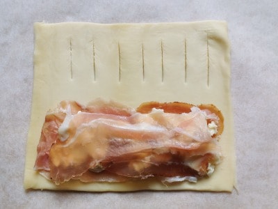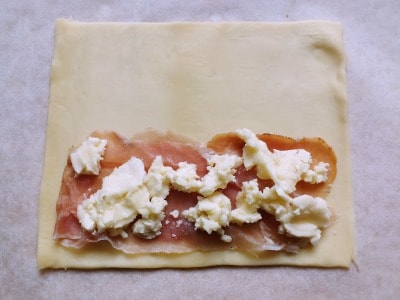 Sur la partie inférieure de chaque rectangle (et sur le côté de 13 cm), déposer une demi-tranche de speck et y ajouter également des morceaux de brie (je vous conseille de laisser au moins un demi-centimètre d’espace libre pour mieux fermer le panier).