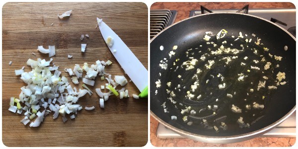 Retirer les racines et la gaine extérieure de la ciboule et la couper finement ; puis la faire frire dans quelques cuillères à soupe d’huile dans une grande sauteuse.