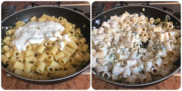 Cuire les pâtes dans beaucoup d’eau bouillante salée ; les égoutter al dente en gardant un peu de leur eau de cuisson et les transférer dans la sauteuse avec les courgettes.
