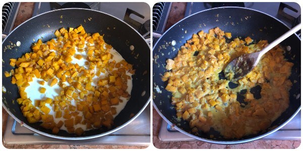 Une fois la courge prête, verser le lait chaud dans la poêle et écraser une bonne partie des dés avec le dos d’une cuillère en bois pour former une belle crème. Ajoutez quelques autres cuillères de lait si besoin pour adoucir la sauce. Corriger le sel, si nécessaire.