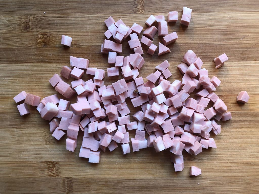 Pendant ce temps, dans une large poêle, faites fondre une noix de beurre avant d’ajouter les dés de mortadelle.