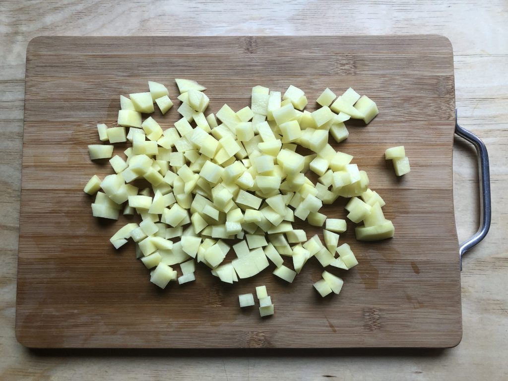 • Pendant ce temps, éplucher les pommes de terre, les laver et les couper en petits morceaux.