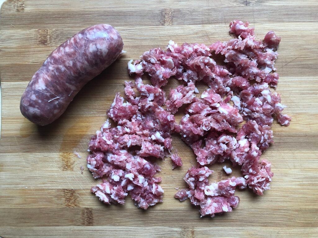 Enlever le boyau des saucisses et les émietter avec une fourchette.