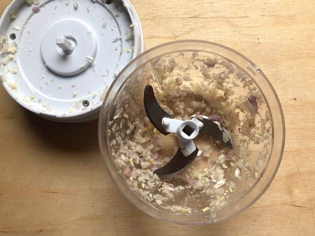 Peler la gousse d’ail et l’échalote et les hacher finement. J’ai utilisé un hachoir manuel à corde que je trouve vraiment très pratique. Si vous souhaitez l’acheter, vous pouvez le trouver en cliquant ICI.