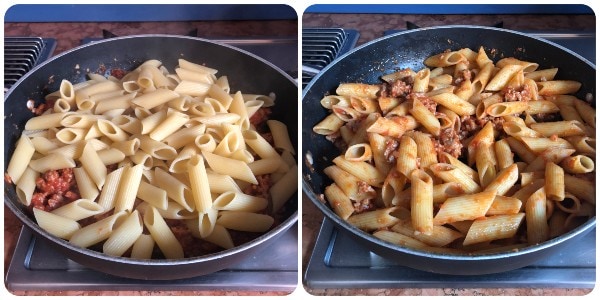 Pendant ce temps, cuire les pâtes dans une grande quantité d’eau bouillante salée. Les égoutter très al dente et les transférer immédiatement dans la casserole de la sauce. Mélanger pour bien amalgamer tous les ingrédients.