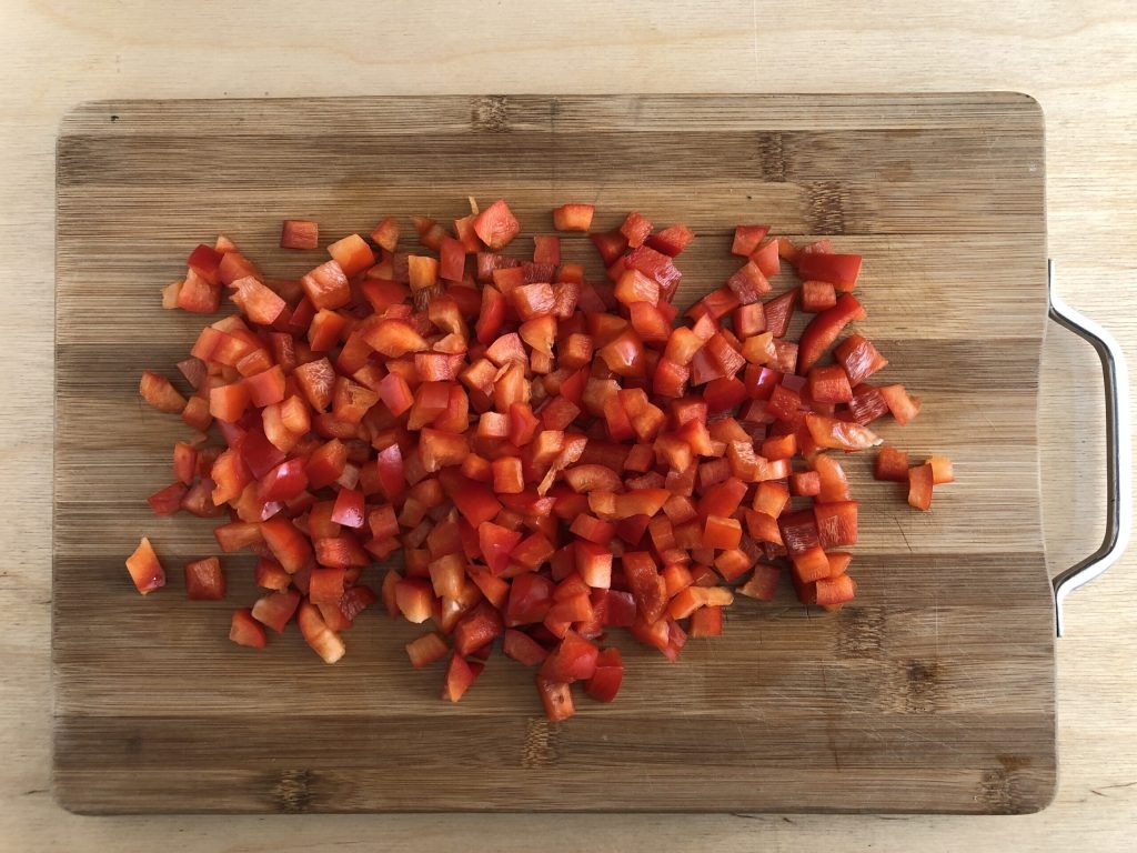 Laver les poivrons, les sécher avec du papier absorbant, enlever la tige, toutes les graines et les filaments blancs à l’intérieur, et les couper en petits dés.