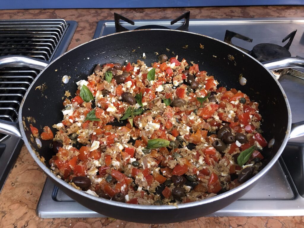 Après ce temps, ajouter les câpres dessalées, les olives taggiasche et le thon bien égoutté de son huile de conservation. Saler et poivrer à volonté. Je mets toujours beaucoup de poivre noir car j’adore ça.