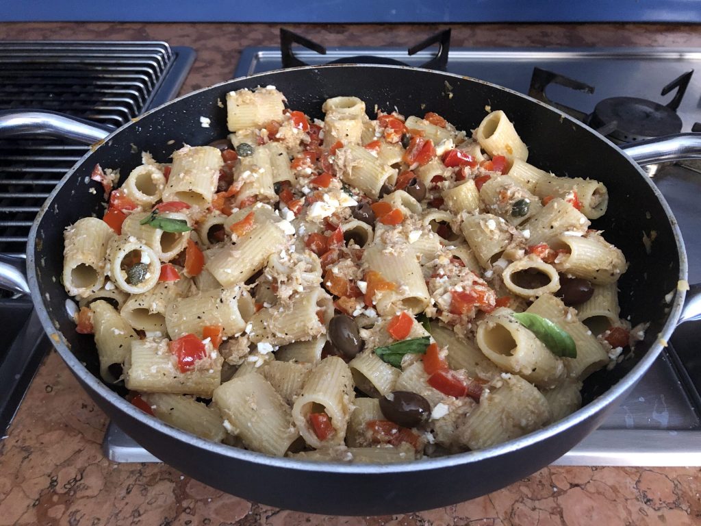 Répartir les pâtes au thon et aux poivrons dans les assiettes individuelles et les servir décorées avec quelques miettes de feta supplémentaires et aromatisées avec quelques feuilles de basilic et du poivre noir fraîchement moulu. Bon appétit ! Paola.