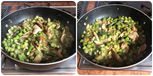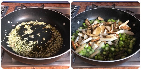 Dans une grande poêle, chauffez quelques cuillères à soupe d’huile et faites revenir l’échalote. Laissez-la grésiller un instant, puis ajoutez les asperges et les champignons.
