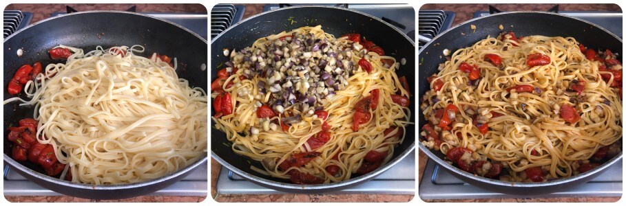 • Cuisez les pâtes (j’ai utilisé des linguines mais des spaghettis ou des pâtes courtes conviennent aussi si vous préférez) dans beaucoup d’eau bouillante salée. Égouttez-les al dente mais sans trop les égoutter et transférez-les directement dans la casserole des tomates cerises. Puis, complétez avec les aubergines.