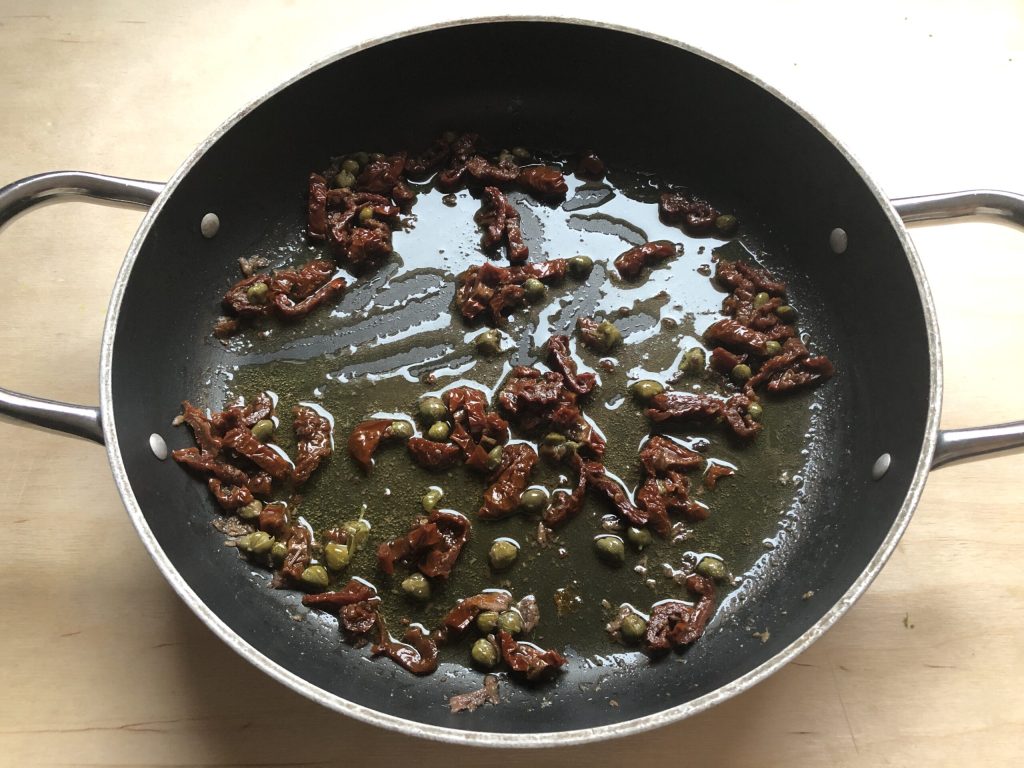 Puis ajouter les tomates séchées et les câpres en mélangeant quelques instants à feu moyen.
