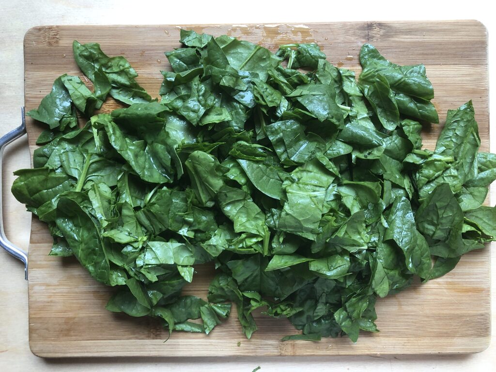 Bien laver les épinards sous l’eau courante, enlever les tiges et les couper grossièrement avec un couteau.