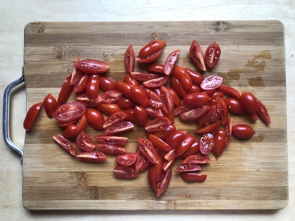 Laver aussi les tomates cerises. Couper en deux les plus petites et en quartiers les plus grosses.