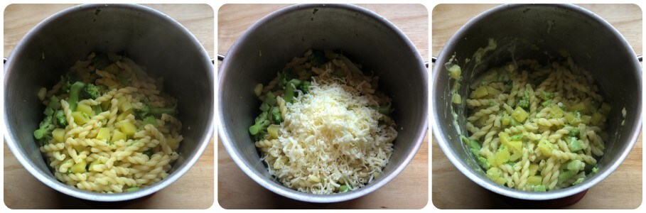 Mettre de côté une louche d’eau de cuisson, puis égoutter les pâtes al dente avec tous les légumes (le brocoli se sera plutôt défait) et les transférer de nouveau dans la casserole encore chaude.