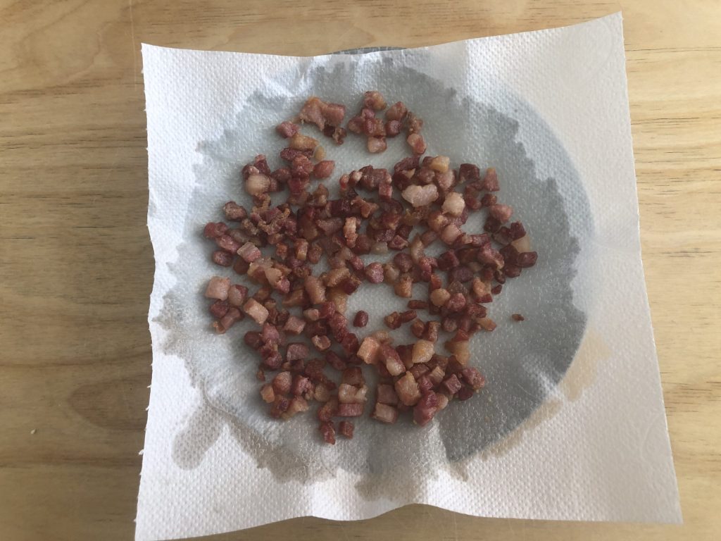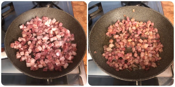 Chauffer très bien une petite poêle, puis ajouter les lardons en dés et les faire bien dorer sans aucun assaisonnement jusqu’à ce qu’ils soient dorés et croustillants.