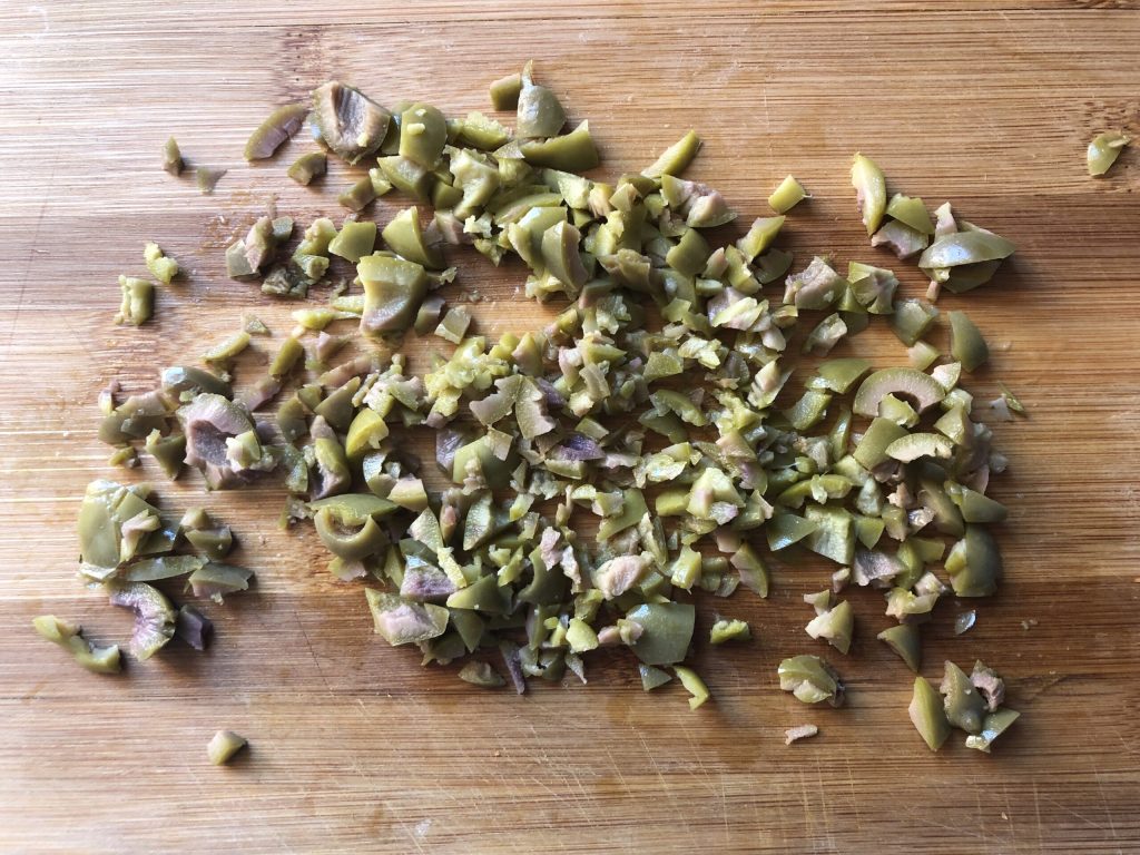 Avec un couteau ou une demi-lune, hachez grossièrement les olives vertes.