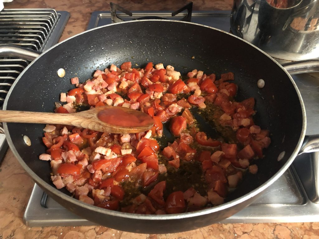 Ajoutez ensuite les dés de lard fumé et faites-les revenir pendant quelques minutes en les remuant souvent.