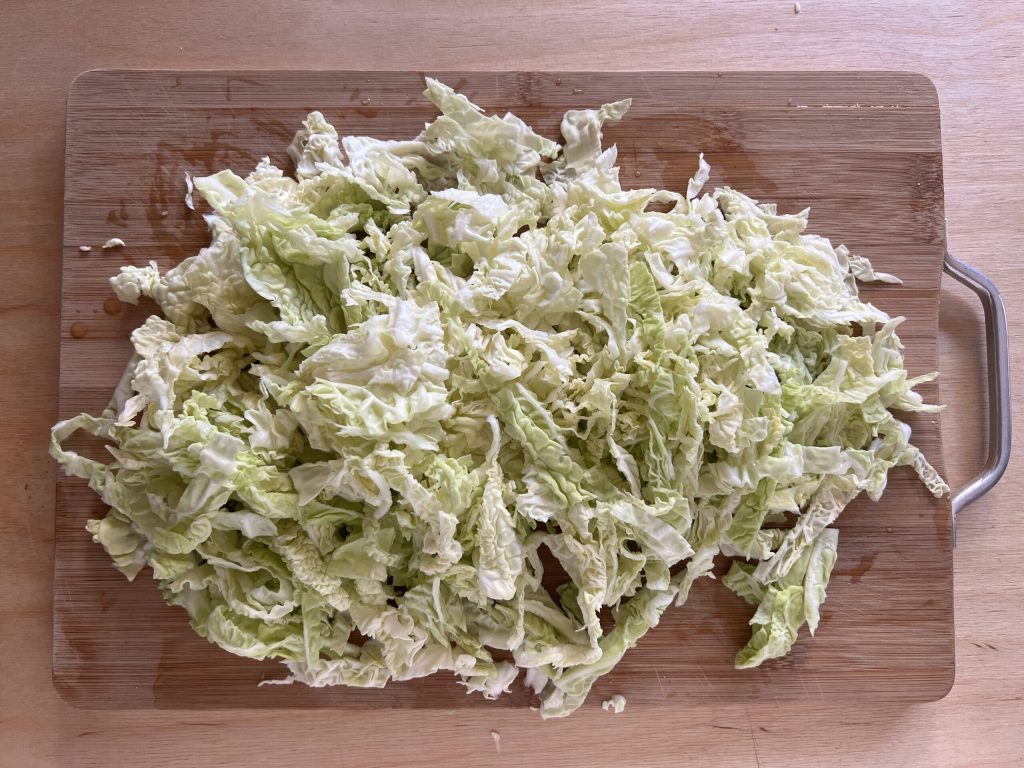Retirer la partie centrale la plus dure des feuilles de chou, les laver sous l’eau courante, les égoutter et les couper en fines lanières.