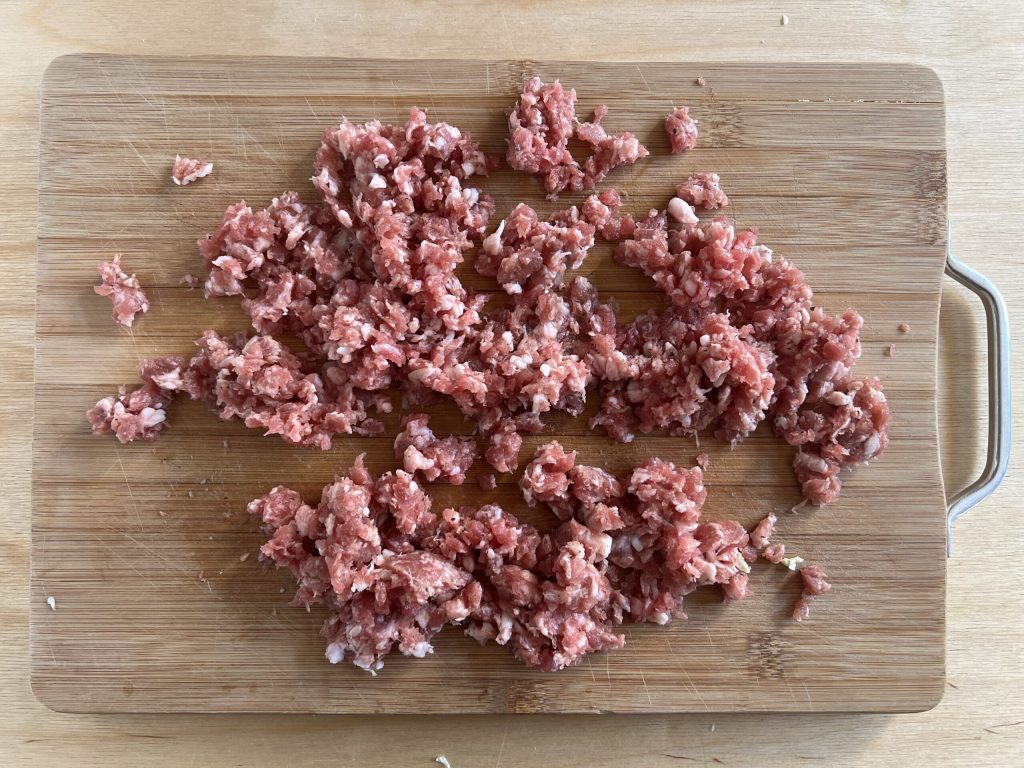 Éplucher l’échalote et la hacher finement. J’ai utilisé un hachoir manuel à corde, un ustensile simple mais vraiment pratique en cuisine. Si vous souhaitez l’acheter, vous pouvez le trouver en cliquant ICI.