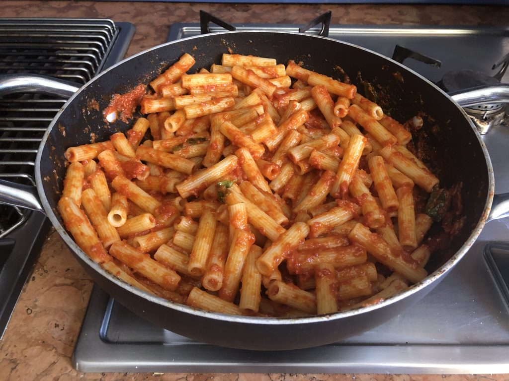 Cuire les pâtes dans une grande quantité d’eau bouillante salée, les égoutter al dente et les transférer directement dans la casserole de la sauce. Mélanger soigneusement jusqu’à ce qu’elles soient parfaitement enrobées de sauce.