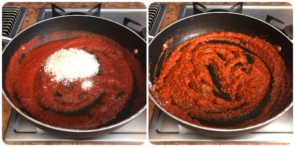 Laisser frémir quelques instants, puis ajouter les tomates mixées et une pincée de bicarbonate pour en éliminer l’acidité.