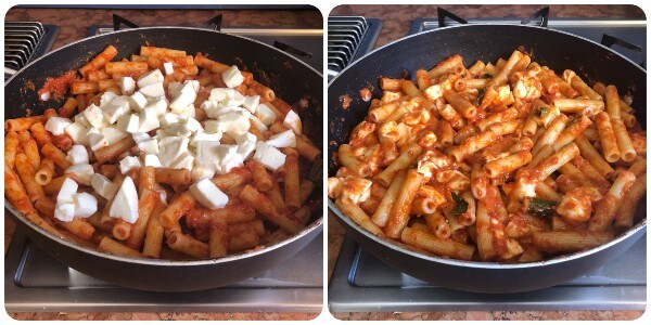 À ce stade, ajouter également les dés de mozzarella qui fondront légèrement grâce à la chaleur des pâtes.