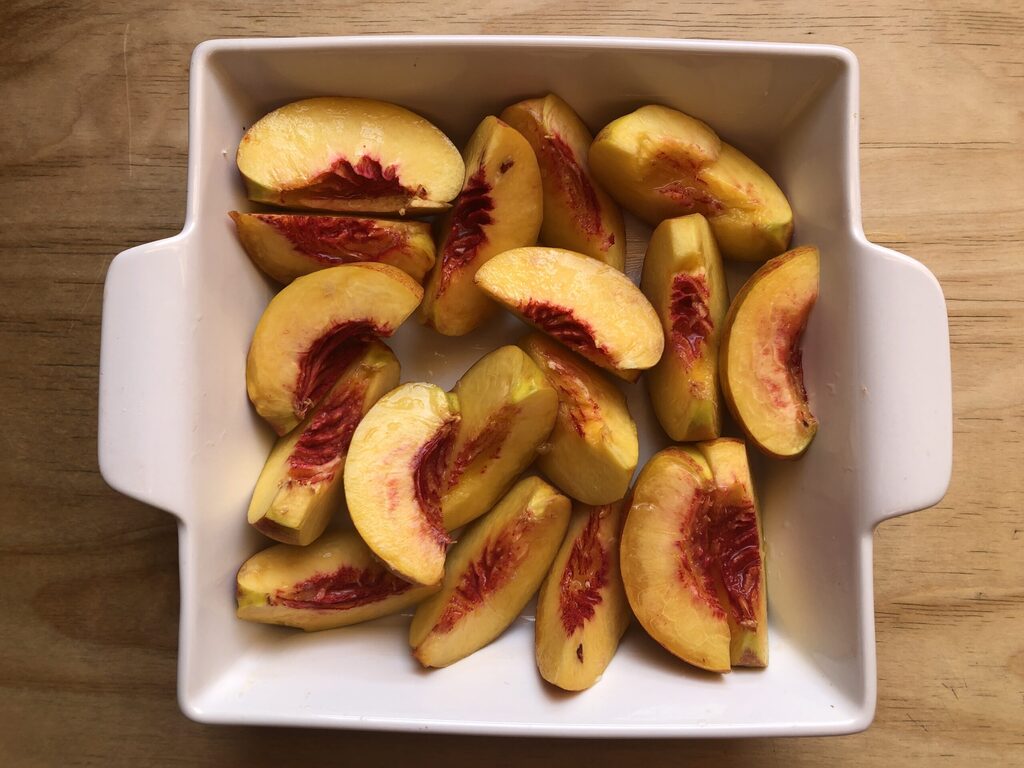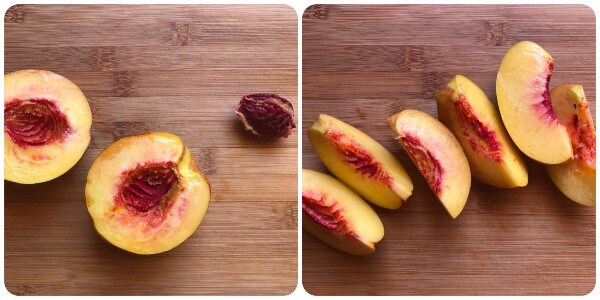 Laver les pêches, les sécher en les tapotant avec du papier absorbant, les couper en deux et retirer le noyau. Ensuite, diviser chaque moitié en 3 quartiers.