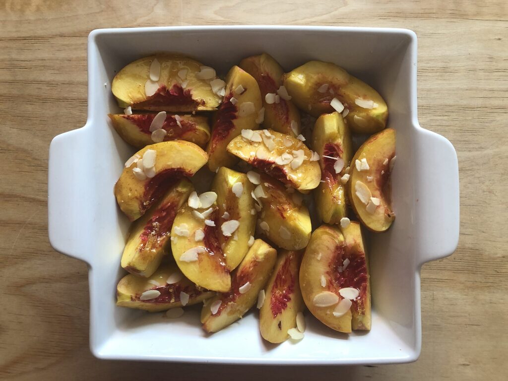 Écraser les amaretti (j’ai utilisé un pilon, mais un verre fera aussi l’affaire) et les saupoudrer sur les pêches.