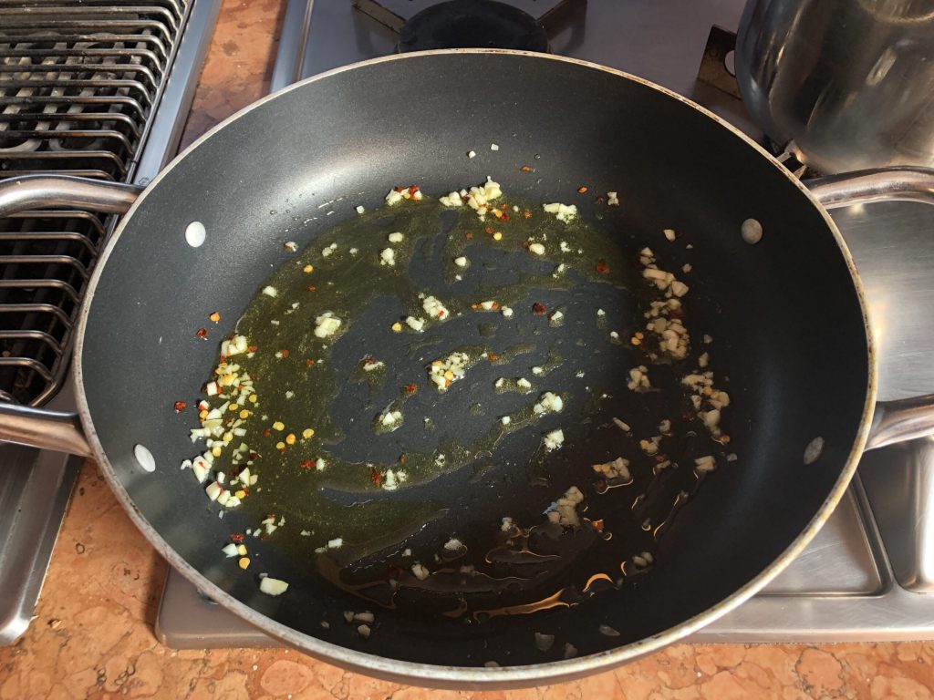 • Dans une grande poêle, chauffer quelques cuillères d’huile et y faire revenir la gousse d’ail finement hachée avec le piment (j’en ai mis peu, mais vous pouvez en mettre plus ; la quantité dépend du goût personnel).