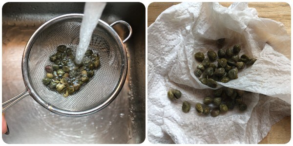 Dessaler les câpres sous l’eau courante et les tamponner avec du papier absorbant.