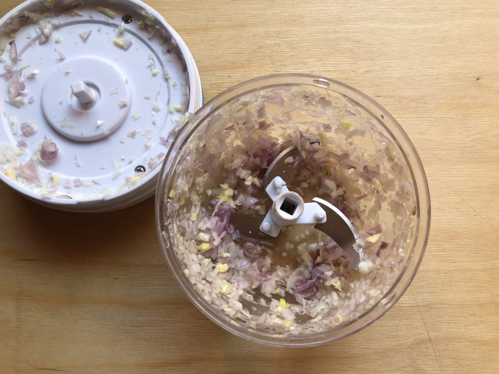 • Épluchez l’échalote et la gousse d’ail et hachez-les finement. J’ai utilisé un petit hachoir manuel à cordon, un petit allié en cuisine que je trouve extrêmement pratique et commode. Si vous souhaitez l’acheter, ICI.