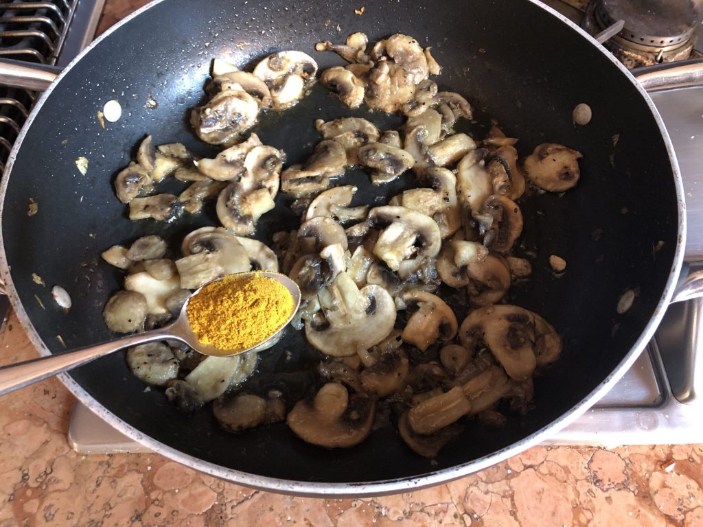 • Quand l’eau des champignons sera complètement évaporée, baissez le feu, ajoutez le curry et mélangez pendant environ 30 secondes, juste le temps de libérer son parfum. Faites attention à ne pas le brûler.