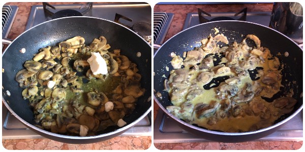 • Ajoutez les champignons au fond de cuisson, augmentez légèrement le feu et laissez-les cuire jusqu’à ce qu’ils rendent leur eau et commencent à dorer (cela prendra environ 6/7 minutes). À ce stade, salez et poivrez selon votre goût.