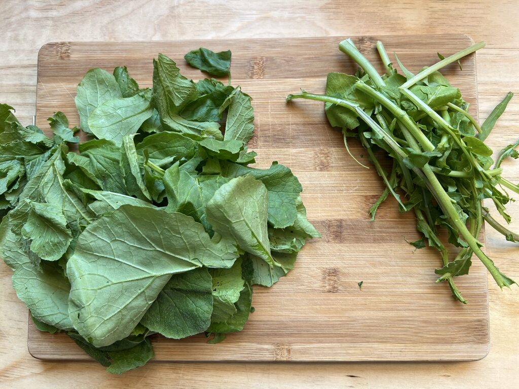 Bien laver les feuilles des radis et les sécher avec une essoreuse à salade. Éliminer ensuite les tiges les plus grosses et dures.
