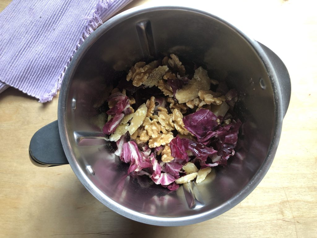Le pesto de chicorée et noix est prêt ! Goûtez-le et ajustez le sel et le poivre, si nécessaire. Si vous souhaitez une crème plus douce, vous pouvez augmenter la quantité d’huile. Pour ma part, je préfère ne pas exagérer et adoucir le pesto avec l’eau de cuisson des pâtes au moment de l’utilisation. Enjoy! Paola