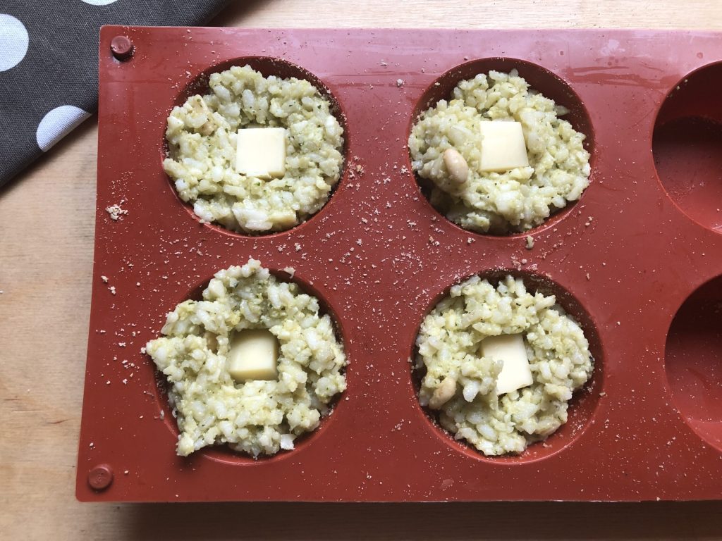 • Mettre le riz bouilli désormais froid dans un bol, ajouter l’œuf, le fromage râpé, le pesto à la génoise, une pincée de sel, un généreux tour de poivre noir et la chapelure et mélanger soigneusement.