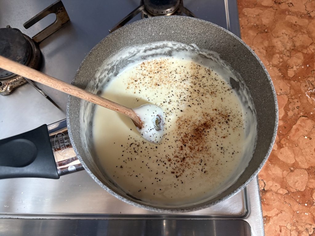 • À ce stade, verser la crème en filet et continuer à mélanger pour éviter la formation de grumeaux. Pour une version plus légère, vous pouvez remplacer la crème par du lait.