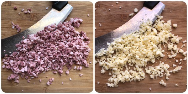 • Hacher grossièrement le jambon cuit et la scamorza et les mettre de côté. Vous pouvez faire cette opération dans un mixer en veillant à ne pas les transformer en sorte de pâté. En alternative, vous pouvez utiliser un hachoir, comme je l’ai fait.