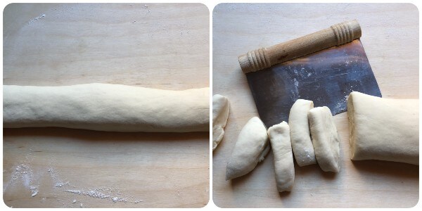 Après le temps de levée, transférer la pâte sur le plan de travail, former un rouleau et en découper des morceaux d’environ 30 g chacun.