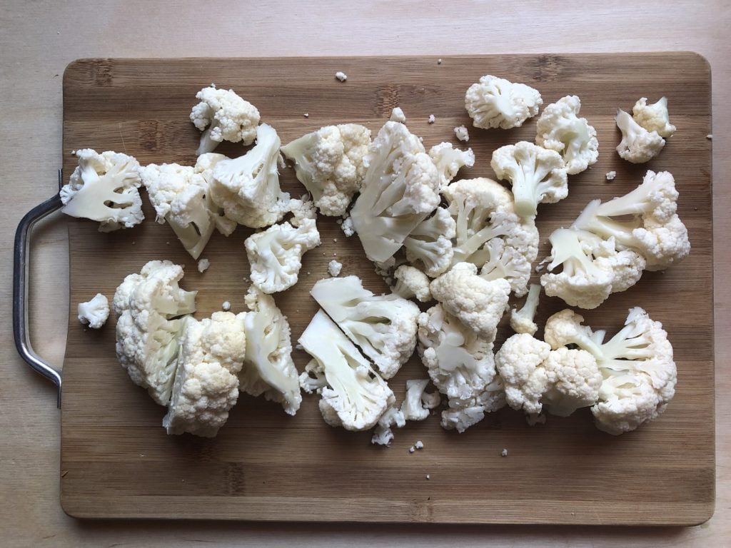 Nettoyer le chou-fleur, le diviser en bouquets, les laver, les sécher avec du papier absorbant et les couper en morceaux.