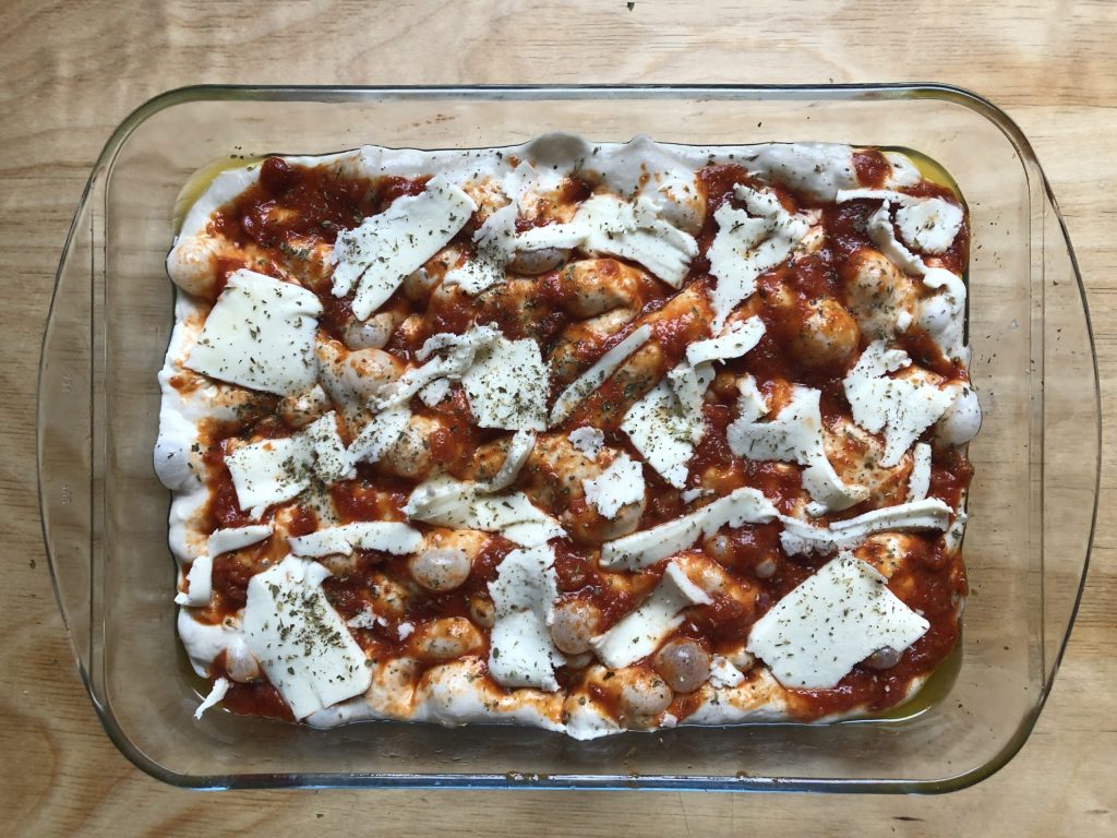 Ensuite, disposer ici et là des tranches de mozzarella (je vous recommande d’utiliser celle pour pizza vendue en blocs compacts car elle ne libère pas d’eau à la cuisson) et saupoudrer d’origan sec.