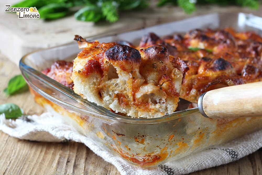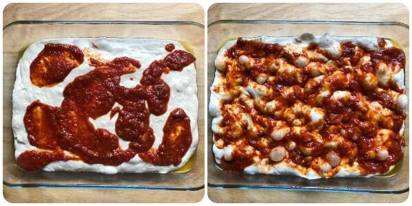À la fin de la dernière levée, répartir la sauce préparée sur la surface de la pâte avec une cuillère et la faire pénétrer dans la pâte en appuyant légèrement avec les doigts.