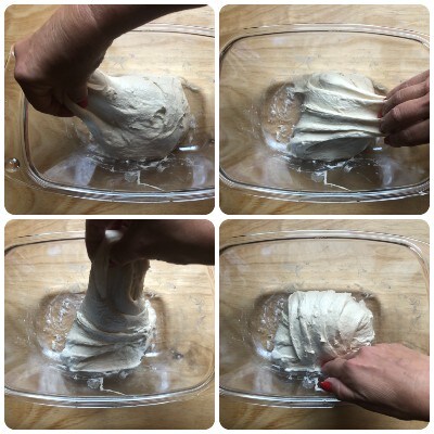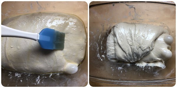 Passé cette demi-heure d' »acclimatation », badigeonner la pâte avec un filet d’huile et faire un nouveau tour de pliages.