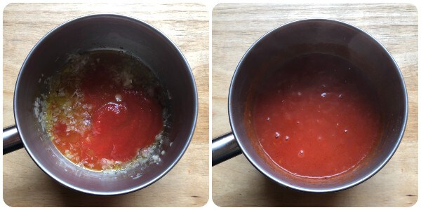 Dans une casserole, chauffer quelques cuillères à soupe d’huile et y faire revenir l’échalote finement hachée.Ensuite, ajouter la purée de tomates et quelques cuillères à soupe d’eau. Mélanger et cuire pendant 4/5 minutes à feu doux.