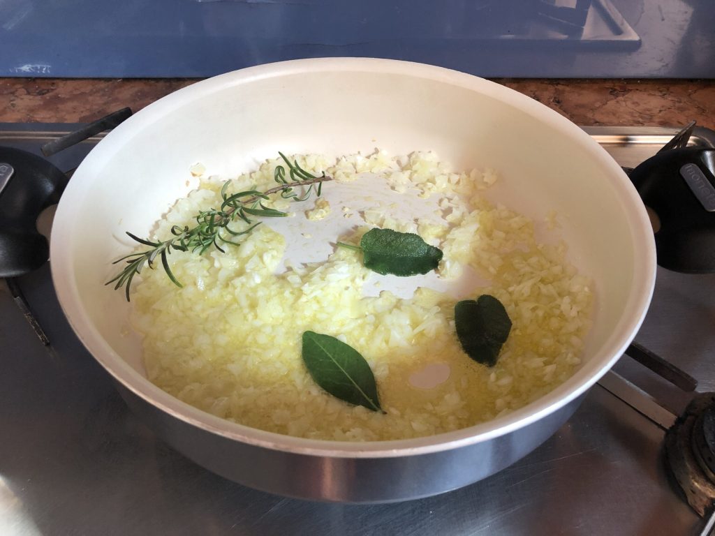 Dans une casserole, faire chauffer un filet d’huile et y faire revenir le hachis d’oignon et d’ail avec les feuilles de sauge, le brin de romarin et la feuille de laurier.