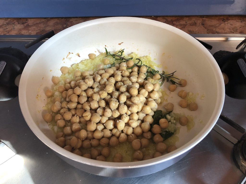 Laisser grésiller quelques instants, puis ajouter les pois chiches au sofrito et assaisonner le tout avec une généreuse pincée de sel et un bon tour de moulin à poivre noir.