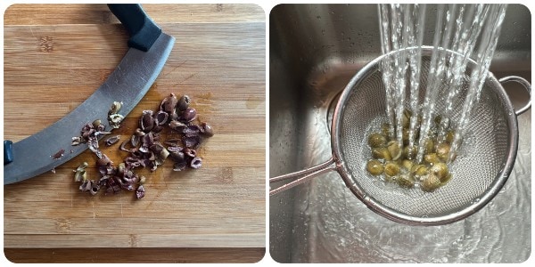 Entre-temps, dessaler les câpres sous l’eau courante et les sécher avec du papier absorbant.